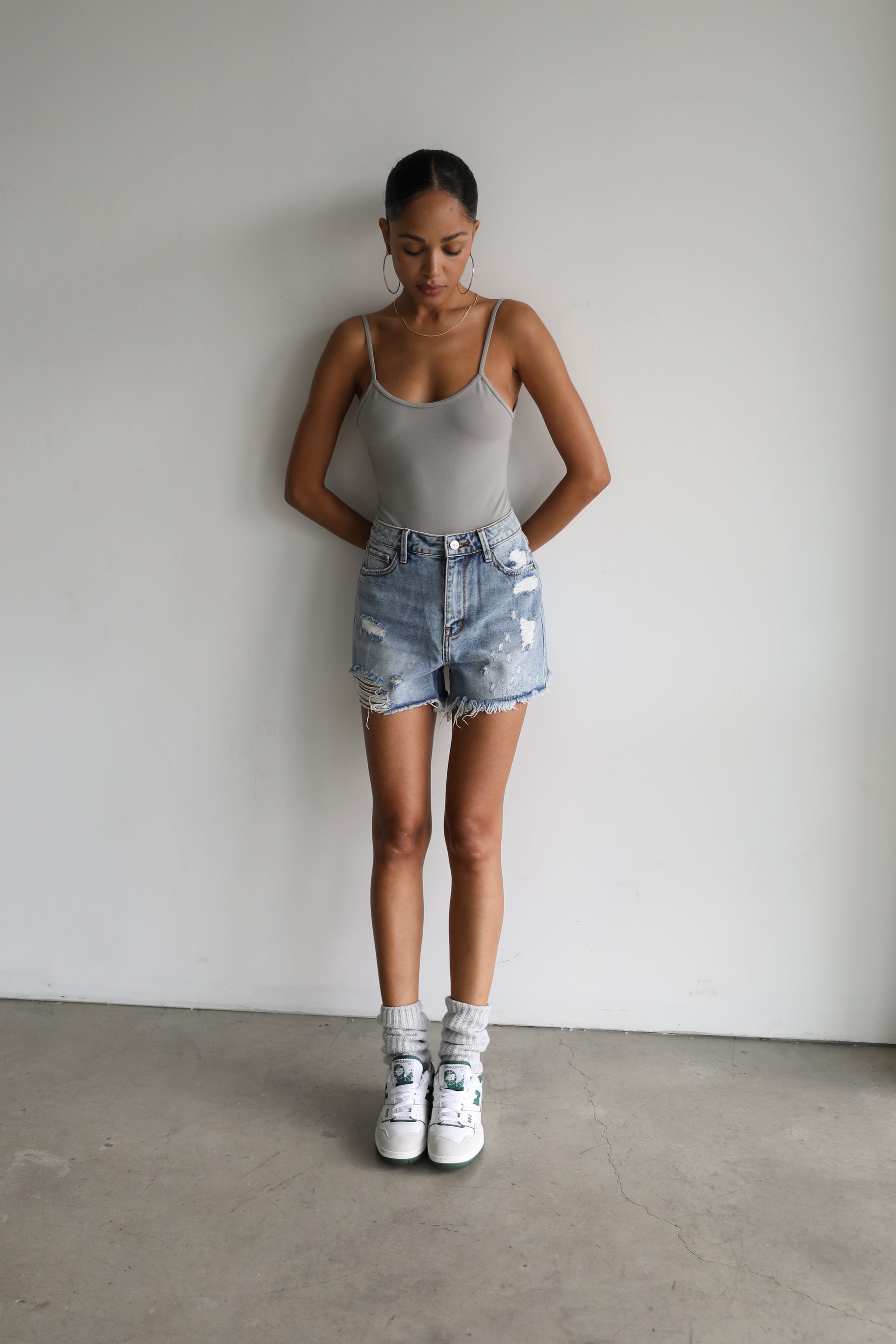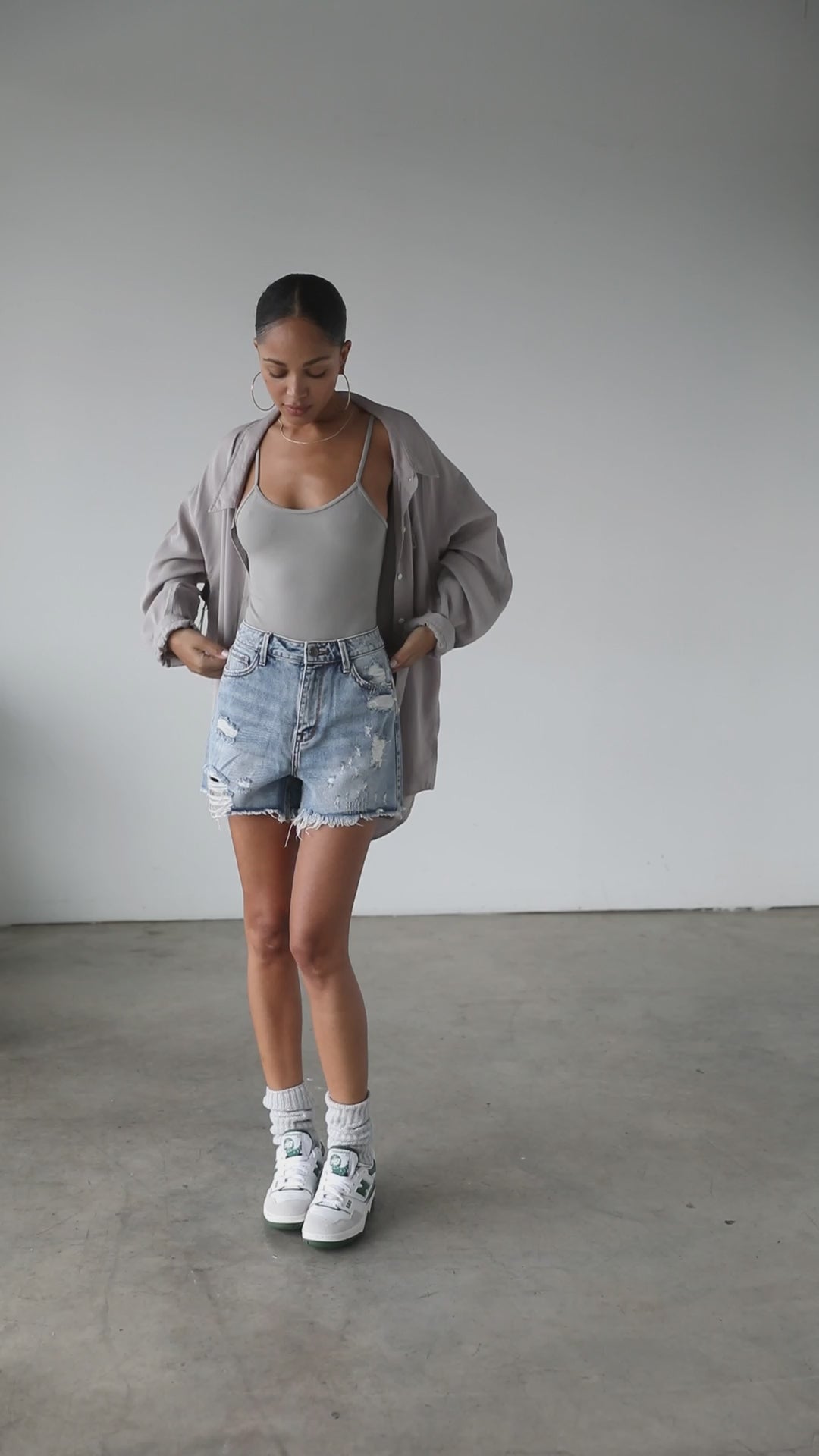 For a timeless look, reach for the DOGMA DENIM High Rise Distressed Denim Shorts. These denim shorts feature a high-rise silhouette and a lightly distressed wash, making them a stylish and effortless choice for any casual ensemble.